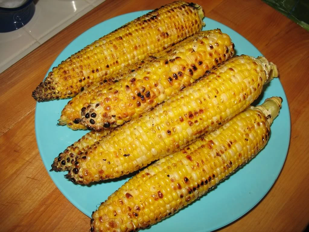 3. Char the corn on a hot grill for 6 minutes (or over a gas flame or under a broiler) or until the kernels are slightly blackened and begin to pop.